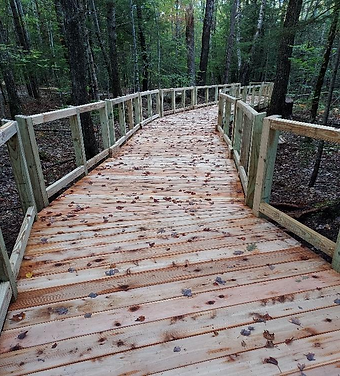 The 75’ boardwalk section leading to the viewing platform is framed. The approximate 150’ stone dust section of the trail leading to the boardwalk is in place.